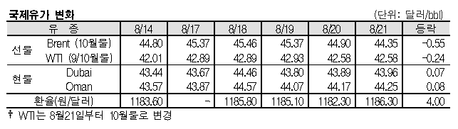 8월21일 국제유가는 유로(EURO)존의 경기 회복이 둔화된 영향으로 하락했다. 8월21일 국제유가는 유로존의 경기 회복 추세가 둔화된 영향으로 하락했다. 표, 그래프: <국제유가 변화> <화학저널 2020/08/24> |