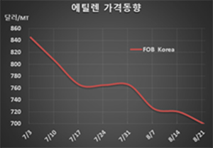 에틸렌 시세는 8월21일 FOB Korea 톤당 700달러로 20달러 하락했으나 CFR SE Asia는 690달러로 변동이 없었다. CFR NE Asia는 한때 690달러까지 떨어졌으나 8월21일 715달러로 25달러 하락한 채 거래를 마감했다.
