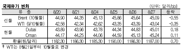 8월27일 국제유가는 미국 멕시코만 생산설비들의 조기 복구에 대한 기대감 영향으로 하락했다. 8월27일 국제유가는 허리케인으로 가동을 중단했던 미국 생산설비들이 조기에 재가동할 것이라는 기대 아래 하락했다. 표, 그래프: <국제유가 변화> <화학저널 2020/08/28> |