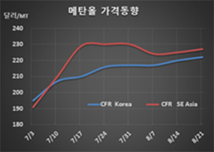 표, 그래프: <Methanol 가격동향> <화학저널 2020/08/28> |