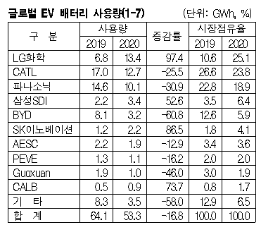 글로벌 EV 배터리 에너지 총량은 1-7월 53.3GWh로 전년동기대비 16.8% 감소했다. 코로나19(신종 코로나바이러스 감염증) 사태로 EV 수요가 감소한 여파로 파악되고 있다.