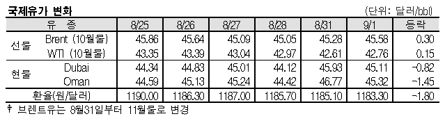 9월1일 국제유가는 주요국의 경제지표 개선 영향으로 상승했다.