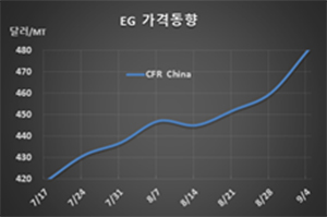 MEG 시세는 9월4일 CFR China 톤당 480달러로 20달러 상승했고 CFR SE Asia도 483달러로 20달러 올랐다.
