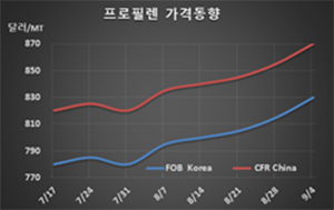프로필렌 시세는 9월4일 FOB Korea 톤당 830달러로 15달러 상승했고 CFR SE Asia 역시 805달러로 10달러 올랐다. CFR Taiwan 역시 875달러로 15달러 상승했다.