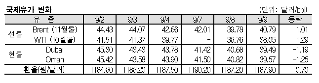 9월9일 국제유가는 급락에 따른 매수세 유입으로 상승했다. 9월9일 국제유가는 단기간 급락으로 매수세가 유입됨으로써 상승했다. 표, 그래프: <국제유가 변화> <화학저널 2020/09/10> |