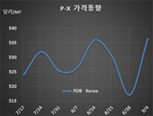 P-X 시세는 9월4일 FOB Korea 톤당 537달러로 20달러 상승했고 CFR SE Asia도 540달러로 20달러 올랐다. CFR China 역시 555달러로 19달러 상승했다.