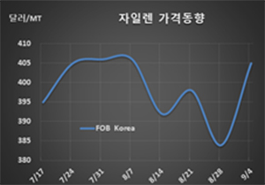 표, 그래프: <자일렌 가격동향> <화학저널 2020/09/10> |