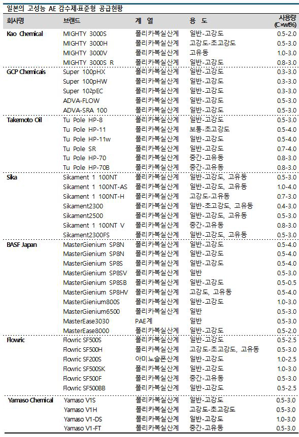 지진이 잦은 일본에서는 구조물의 내구성 확보가 필수적으로 요구돼 콘크리트 고강도화가 빠르게 진전됨에 따라 고성능 AE 감수제 사용이 정착되고 있으며 최근에는 해외에서도 널리 사용되고 있다.