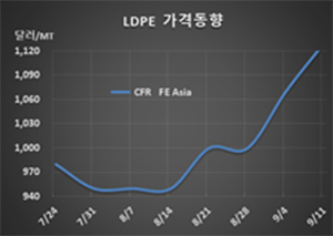 LDPE 시세는 9월9일 CFR FE Asia 톤당 1130달러로 60달러 폭등했으나 CFR SE Asia는 1100달러로 30달러 급등에 그쳤다.