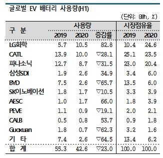 글로벌 전기자동차 배터리 에너지 사용량은 2020년 상반기 42.6GWh로 23.0% 감소했다. 중국과 미국이 코로나19 여파로 침체에서 벗어나지 못한 영향으로 판단된다.