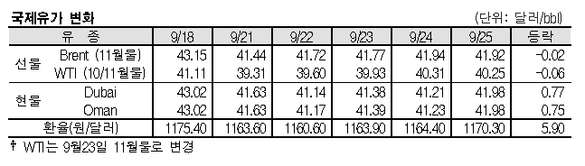 한국석유공사에 따르면, 런던석유거래소(ICE)의 브렌트유(Brent) 선물유가는 배럴당 41.92달러로 전일대비 0.02달러 하락했으며, 뉴욕상업거래소(NYMEX)의 WTI(서부텍사스 경질유)도 0.06달러 떨어져 40.25달러로 거래를 마감했다.