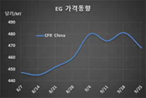 MEG 시세는 9월25일 CFR China 톤당 468달러로 13달러 하락했고 CFR SE Asia 역시 472달러로 12달러 떨어졌다.