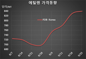 에틸렌 시세는 9월25일 FOB Korea 톤당 840달러로 10달러 상승했고 CFR SE Asia도 820달러로 20달러 올랐다. CFR NE Asia 역시 860달러로 10달러 상승했다.