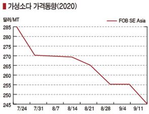 아시아 가성소다 가격은 2020년 들어 중국산이 대량 유입됨으로써 약세를 계속했다.