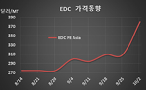 EDC 시세는 10월1일 CFR FE Asia 톤당 380달러로 70달러 폭등했고 CFR SE Asia도 415달러로 70달러 퓨폭등했다.