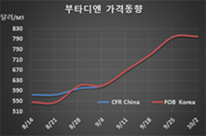 부타디엔 시세는 10월2일 FOB Korea 톤당 800달러, CFR SE Asia 790달러, CFR China 800달러로 변동이 없었다. CFR Taiwan 역시 830달러를 유지했다.