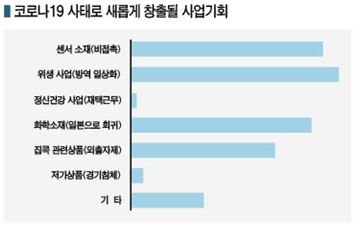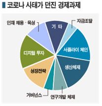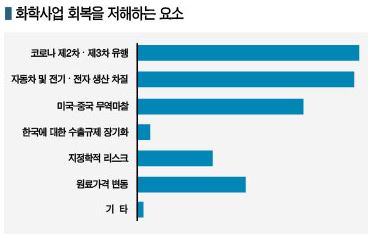 표, 그래프: <화학사업 회복을 저해하는 요소, 앞으로 경영자원을 투입할 분야, 코로나 사태로 얻은 교훈, 코로나 사태가 던진 경제과제, 코로나19 사태로 새롭게 창출될 사업기회>
