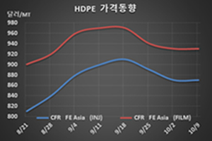 그러나 한국을 중심으로 PE 플랜트들이 풀가동을 계속함으로써 재고량이 쌓여 10월 중순 등락에 관심이 집중되고 있다.