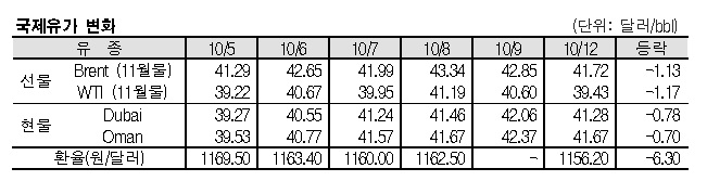 10월12일 국제유가는 리비아의 원유 생산 재개 영향으로 하락했다. 10월12일 국제유가는 리비아의 원유 생산 재개가 임박했다는 소식이 알려지면서 하락했다. 표, 그래프: <국제유가 변화> <화학저널 2020/10/13> |