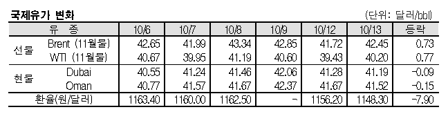 10월13일 국제유가는 중국이 원유 수입을 확대한 영향으로 상승했다. 10월13일 국제유가는 중국의 원유 수입이 증가함에 따라 상승했다. 표, 그래프: <국제유가 변화> <화학저널 2020/10/14> |
