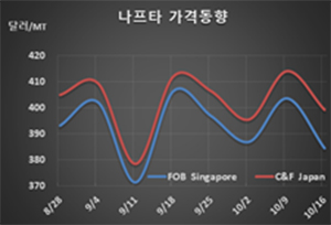나프타 시세는 10월16일 C&F Japan 톤당 399달러로 15달러 급락했고 FOB Singapore 역시 384달러로 20달러 폭락했다. CIF NWE는 382달러, FOB USG는 358달러를 형성했다.