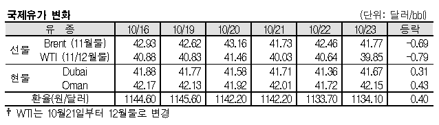 10월23일 국제유가는 주요국의 코로나19(신종 코로나바이러스 감염증) 방역조치 강화로 하락했다. 10월23일 국제유가는 주요국의 코로나19 확산 및 이동제한 조치 강화 영향으로 하락했다. 표, 그래프: <국제유가 변화> <화학저널 2020/10/26> |