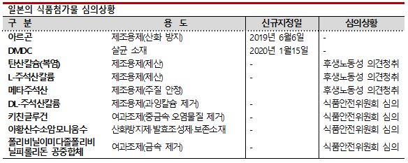 표, 그래프: <일본의 식품첨가물 심의상황> <화학저널 2020년 11월 2·9일> |