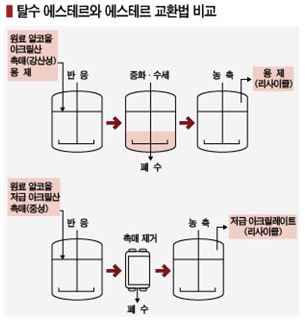 반면, 에스테르 교환 공법은 원료 알코올에 아크릴산에스테르(Ester Acrylate)를 추가하기 때문에 거의 중성상태에서 반응시킬 수 있으며 폐수가 발생하지 않아 탈수 용제를 사용하지 않아도 되는 것이 강점이다.
