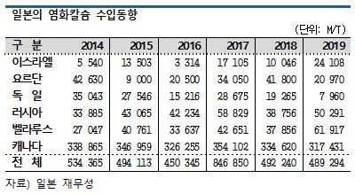 일본 가성칼륨 시장은 2018년 수요기업이 사료첨가물 생산설비를 증설해 가동을 시작하고 수입이 계속 줄어듦에 따라 생산량이 9.0% 증가했으나 2019년에는 생산량이 11만6517톤으로 1.4%, 판매량이 10만224톤으로 0.9% 감소했다.