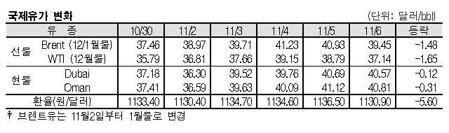 11월6일 국제유가는 코로나19(신종 코로나바이러스 감염증)와 미국 대통령 선거 영향으로 급락했다. 11월6일 국제유가는 코로나19 확산 영향으로 하락했다. 표, 그래프: <국제유가 변화> <화학저널 2020/11/09> |
