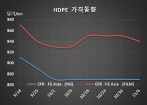 표, 그래프: <HDPE 가격동향> <화학저널 2020/11/09> |