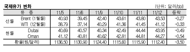 11월12일 국제유가는 주요 기관의 석유 수요 전망치 하향조정 영향으로 하락했다. 11월12일 국제유가는 주요 기관이 석유 수요 전망치를 하향 조정한 영향으로 하락했다. 표, 그래프: <국제유가 변화> <화학저널 2020/11/13> |