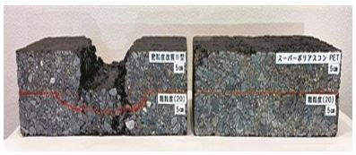 폐PET 뉴트랙을 배합한 아스팔트는 포장 평방미터당 PET병 약 15개를 재이용하는 셈이며 성능은 기존제품과 동일한 것으로 평가되고 있다.