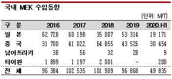 국내 MEK(Methyl Ethyl Ketone) 수입시장에서 중국산이 1위를 달리고 있다. 표, 그래프: <국내 MEK 수입동향> <화학저널 2020년 11월 23일> |