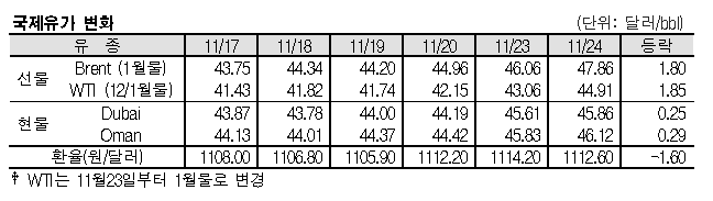 11월24일 국제유가는 코로나19(신종 코로나바이러스 감염증) 백신 개발 영향으로 상승했다. 11월24일 국제유가는 코로나19 백신 개발에 대한 기대가 계속되면서 상승했다. 표, 그래프: <국제유가 변화> <화학저널 2020/11/25> |