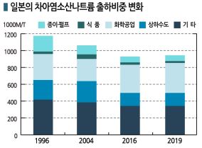 일본은 차아염소산나트륨 수요비중이 화학반응용을 포함한 화학공업용 36%, 소독‧살균 등 상하수도용 17%, 탈묵‧표백 등 종이·펄프용 8%로 3가지가 전체의 60%를 차지하고 있으며 수처리·폐수처리, 식품, 철강용이 뒤를 잇고 있다.