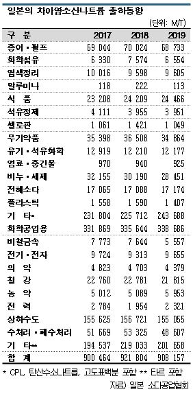 일본은 종이·펄프 및 상하수도용 수요가 줄어들면서 차아염소산나트륨 수요가 감소세를 지속하고 있다.