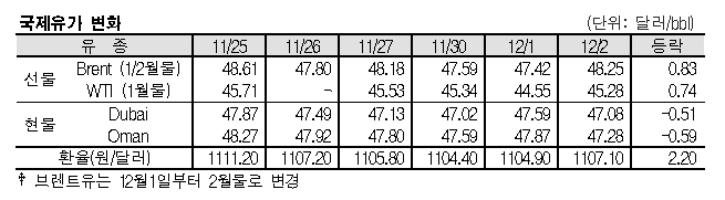 12월2일 국제유가는 영국의 코로나19(신종 코로나바이러스 감염증) 백신 승인 영향으로 상승했다. 12월2일 국제유가는 영국이 코로나19 백신 사용을 승인함에 따라 상승했다. 표, 그래프: <국제유가 변화> <화학저널 2020/12/03> |