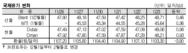 12월3일 국제유가는 OPEC(석유수출국기구)+ 관련 불확실성 해소 영향으로 상승했다. 12월3일 국제유가는 OPEC+의 생산량 정책 합의에 따른 불확실성 해소 영향으로 상승했다. 표, 그래프: <국제유가 변화> <화학저널 2020/12/04> |