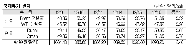 12월16일 국제유가는 미국의 원유 재고 감소 영향으로 상승했다. 12월16일 국제유가는 미국의 원유 재고가 감소한 영향으로 상승했다. 표, 그래프: <국제유가 변화> <화학저널 2020/12/17> |