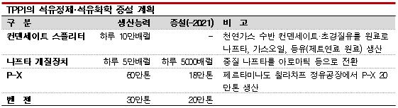 자회사 TPPI가 1억8000만달러를 투자해 나프타(Naphtha) 접촉개질장치 처리능력을 하루 5만5000배럴로 5000배럴 확대하고 있어 수직계열화를 위해 P-X 증설을 결정한 것으로 판단된다.