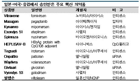 안티센스는 빌텝손 외에 미국 바이오젠(Biogen)의 척수성 근위축증(SMA) 치료제 스핀라자가 있고, siRNA는 미국 앨나일람(Alnylam)의 아밀로이드시스 치료제 온파트로가 잘 알려져 있다.
