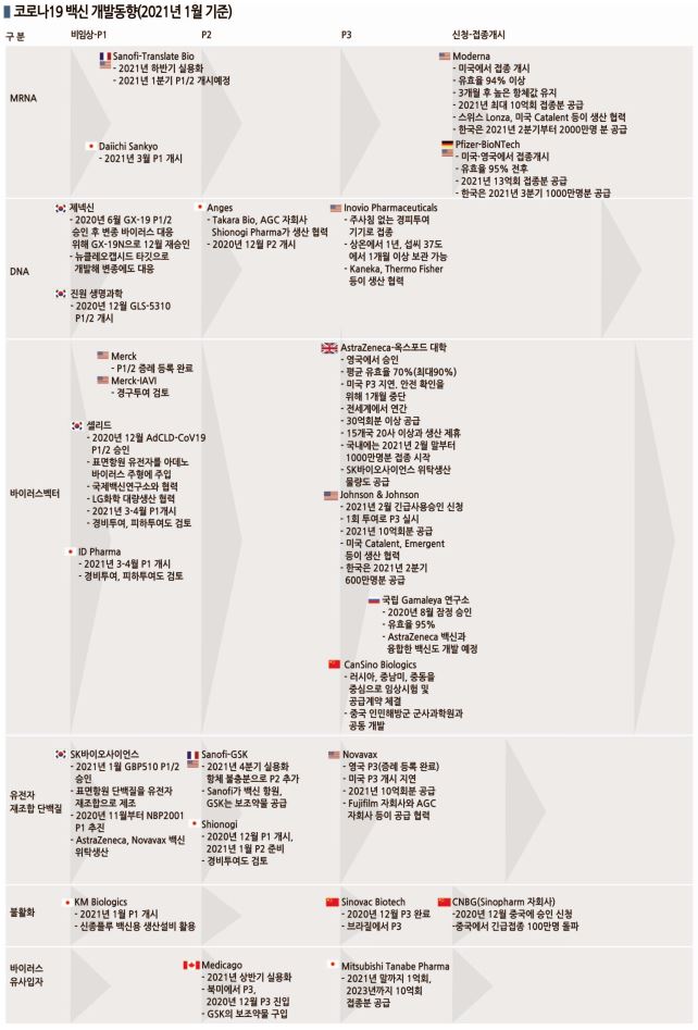 한국은 2021년 2월 말부터 아스트라제네카(AstraZeneca) 백신 접종을 시작하고 2분기에 얀센(Jassen)-존슨앤드존슨(Johnson & Johnson)과 모더나, 3분기에는 화이자 백신을 공급한다.