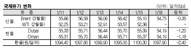 1월18일 국제유가는 코로나19(신종 코로나바이러스 감염증) 백신 배포 지연 영향으로 하락했다. 1월18일 국제유가는 코로나19 백신 배포가 지연된 영향으로 하락했다. 표, 그래프: <국제유가 변화> <화학저널 2021/01/19> |