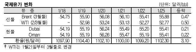 1월25일 국제유가는 미국의 경기부양책에 대한 기대 영향으로 상승했다. 1월25일 국제유가는 미국의 경기부양책에 대한 기대 영향으로 상승했다. 표, 그래프: <국제유가 변화> <화학저널 2021/01/26> |