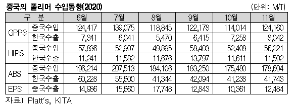 중국 수출 11월 4만톤 그쳐 … GPPS 소폭 증가에 HIPS 감소