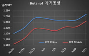 n-부탄올 시세는 1월28일 CFR China 톤당 1270달러로 30달러 상승했고 CFR SE Asia도 1235달러로 30달러 올랐다.