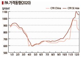 아시아 무수프탈산 시장은 2020년 프탈레이트(Phthalate)계 가소제 수요가 침체되면서 고전했고 연말 폭등했으나 일시적 현상에 불과한 것으로 판단된다.