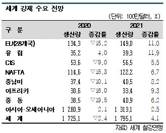 2021년에는 강재 수요가 17억9500만톤으로 4.1% 증가하는 가운데 유럽이 10% 이상의 높은 성장률을 나타내는 등 세계 각지에서 안정적으로 늘어날 것으로 예상되고 있다.