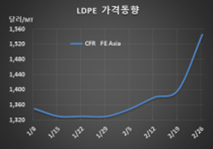 LDPE 시세는 2월24일 CFR FE Asia 톤당 1545달러로 145달러 대폭등했고 CFR SE Asia도 1550달러로 120달러 대폭등했다.